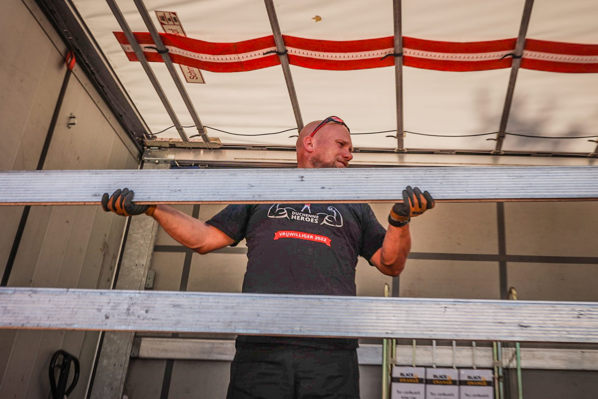 Het transportteam bestuurt de grote vrachtwagens en vervoert alle materialen die nodig zijn om het Duchenne Heroes-dorp weer op te bouwen. Denk aan tenten, banken, tafels, een complete keuken en onze gezellige bar.