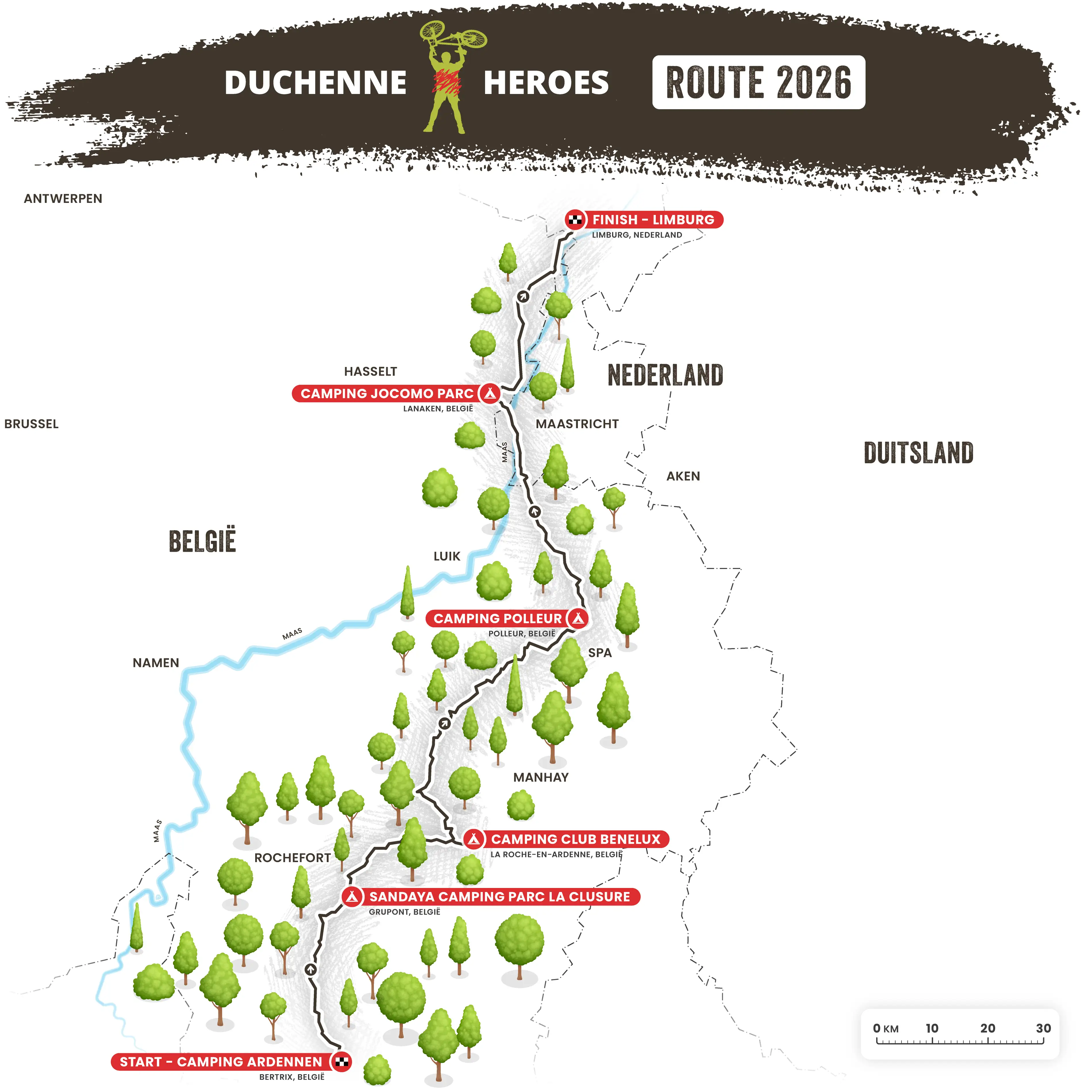 Duchenne Heroes 2026 keert terug naar Belgie! Jij fietst van Bertrix, midden in de Ardennen vlak bij de Franse grens, naar Limburg. Een uitdagende tocht die alles samenbrengt wat offroad fietsen in België zo bijzonder maakt.